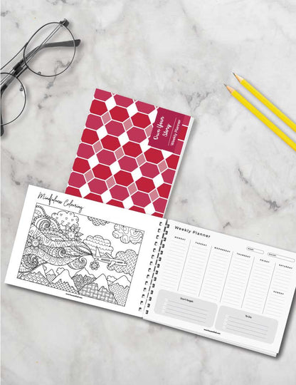 Our Own Your Story hardcover wiro planner features a geometric viva magenta cover design. The new weekly view includes a one view week page and a full page for notes. In addition, there are activity sheets and motivational quotes to keep you going for the whole year.